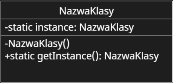 Singleton składa się z trzech elementów. Pierwszy to prywatne, statyczne pole instance, zwracający typ klasy w której jest implementowany. Drugim elementem jest prywatny konstruktor. Trzecią częścią jest metoda getInstance, która zwraca nam instance.
