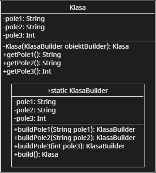 Klasa wewnętrzna, na naszym diagramie KlasaBuilder jest klasą publiczną i statyczną. Klasa wewnętrzna posiada takie same pola jak klasa zewnętrzna oraz są one prywatne. Klasa wewnętrzna posiada również metody, do których jako argumenty przekazywane są konkretne wartości pól klasy. Metody te zwracają typ klasy wewnętrznej (KlasaBuilder), pozwala nam to łączyć („chainować”) w łańcuch, dowolnie dostępne metody w dowolnej kolejności. Powoduje to możliwość inicjalizacji pól w konstruktorze w zależności od naszych potrzeb. Po wywołaniu wybranych metod, wywołujemy metodę build(), która zwraca nam utworzony obiekt o typie klasy zewnętrznej.