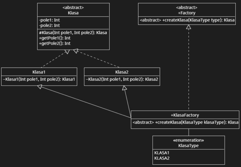Implementacja z użyciem metody fabrykującej opiera się na następujących elementach. Klasa abstrakcyjna „Factory”, z abstrakcyjną metodą publiczną, zwracającą obiekt typu „Klasa”, do której implementowana jest Fabryka. Kolejnym elementem jest „KlasaFactory”, w której to znajduje się metoda zwracająca obiekt klasy1 lub obiekt klasy2 o typie „Klasa”. „KlasaFactory” wykorzystuje „enum”, do określenia jaki typ obiektu chcemy stworzyć z wykorzystaniem metody „createKlasa” w „KlasaFactory”.